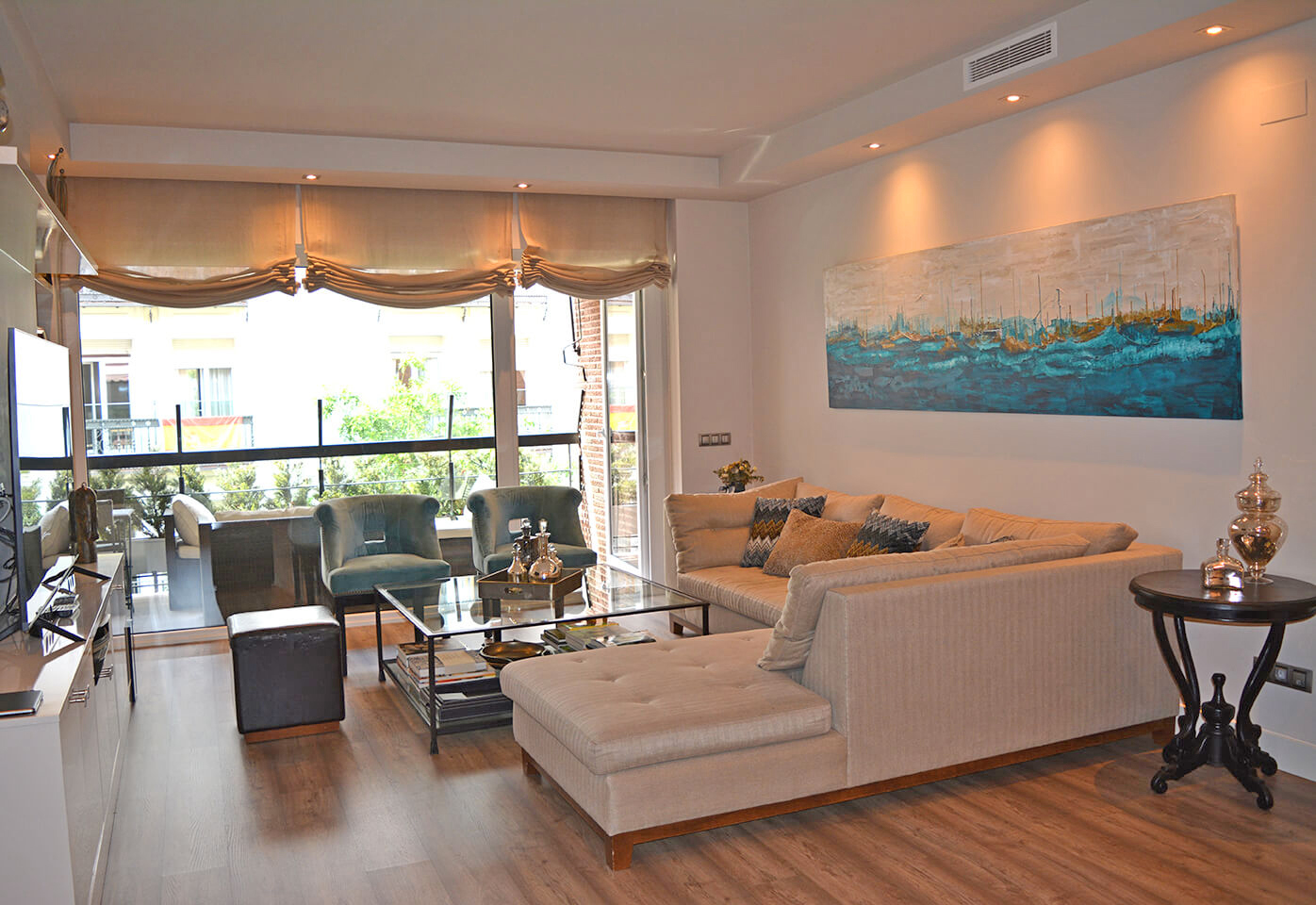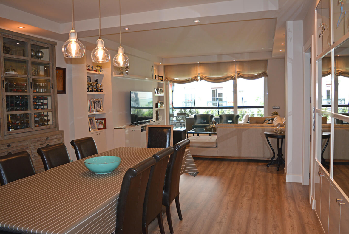 Salón y comedor contiguos con cristalera que da a la terraza de unos 8m2.